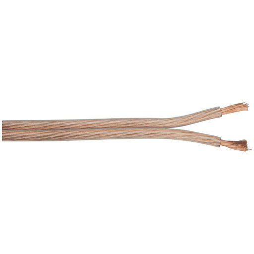 Heavy duty speaker cable for audio equipment up to 150WRMS. Clear outer insulation with black trace for polarity identification.